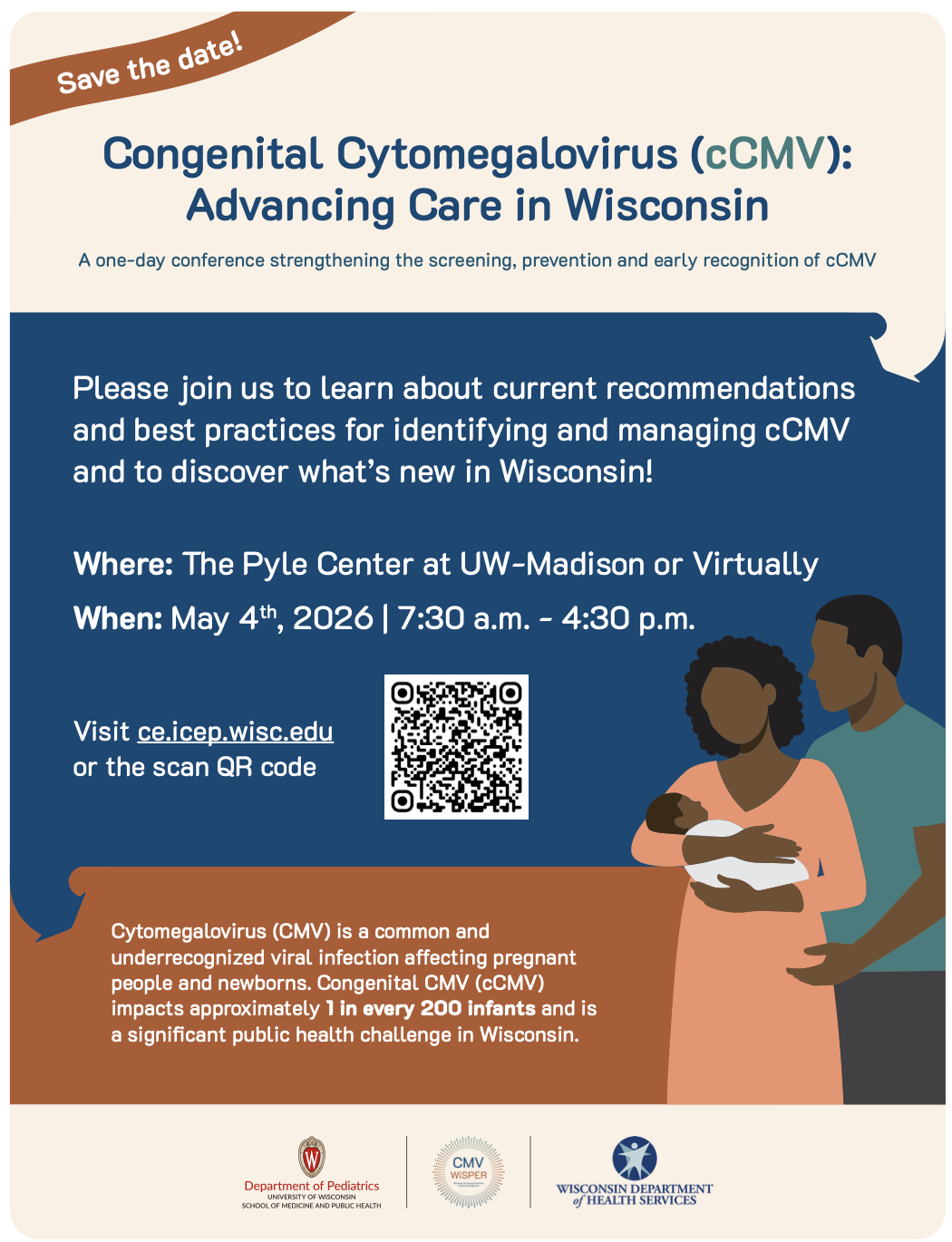This statewide conference will offer participants a comprehensive and up‑to‑date overview of best practices for identifying and managing congenital Cytomegalovirus (cCMV). Attendees will delve into current approaches to screening, clinical follow‑up, and family support, and will gain familiarity with tools and resources developed by the Wisconsin Department of Health Services (DHS) in collaboration with the cCMV WiSPER (Wisconsin Screening, Prevention, and Early Recognition) stakeholder group. Participants will leave this event equipped with practical, actionable strategies to strengthen the care provided to newborns affected by cCMV across Wisconsin.